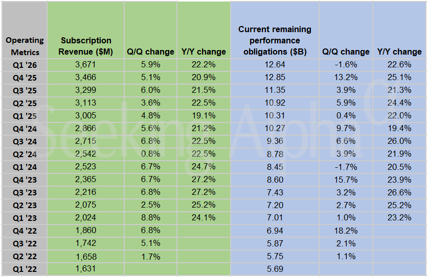 ServiceNow maintains a 22% year-over-year subscription revenue growth rate in Q1, highlighting steady enterprise demand for workflow automation software.