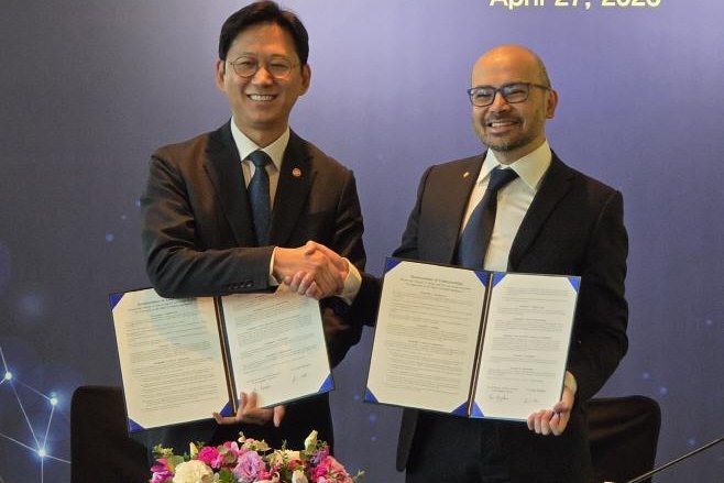 Science Minister Bae Kyung-hoon and DeepMind CEO Demis Hassabis pose after signing an AI cooperation agreement in Seoul on Monday. Photo by Asia Today April 27...